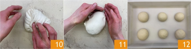 Pegue uma porção de massa de cada vez e puxe as bordas de fora para dentro 10, então enrole-a na bancada para formar bolinhas 11 e coloque-as em uma caixa para fermentação 12. Feche com a tampa e deixe fermentar por cerca de 6-8 horas a uma temperatura de cerca de 18°-24°.