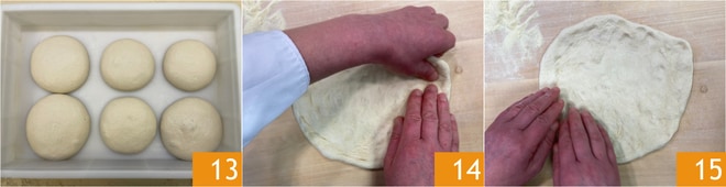 Após o tempo de fermentação, as bolinhas terão dobrado de volume 13. Estenda a primeira bolinha espalhando-a suavemente com as mãos 14, depois pressione a massa com os dedos para formar um disco com cerca de 18 cm de diâmetro, tomando cuidado para não deixá-lo muito fino no centro 15.