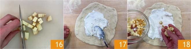 Proceda desta forma para estender todas as bolinhas, depois passe para o recheio: corte a provola em cubos 16, depois misture a ricota com um pouco de leite e espalhe sobre a superfície, deixando as bordas livres 17. Distribua os cubos de provola 18.