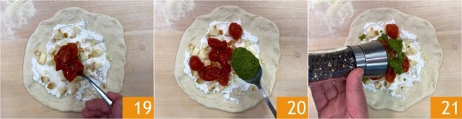 Adicione o molho de tomatinhos 19 e o pesto 20. Por fim, tempere com uma pitada de pimenta 21.
