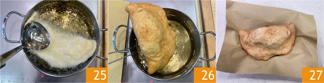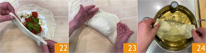 Dobre a massa ao meio 22 para formar uma meia-lua, depois pressione bem ao redor do recheio para eliminar todo o ar 23. Quando estiver com todos os calzones recheados, estará pronto para fritar: em uma panela grande, aqueça o óleo de sementes à temperatura de 180°, depois mergulhe cuidadosamente o calzone 24.