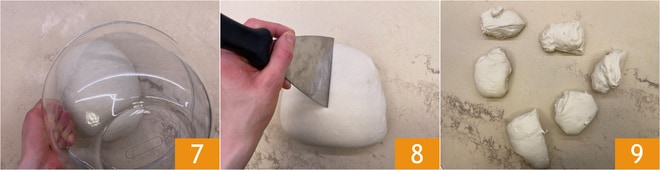 Quando a massa estiver lisa, uniforme e compacta, forme uma bola, cubra com a tigela 7 e deixe descansar à temperatura ambiente por 5 minutos. Após este tempo, faça mais algumas dobras, cubra novamente a massa com a tigela e deixe descansar por mais 30 minutos. Após o tempo de descanso, divida a massa com uma espátula 8 em 6 porções de aproximadamente 280 g cada 9.