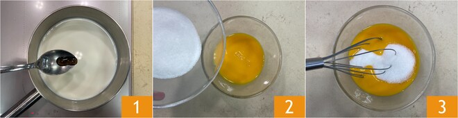 Para preparar a bavaroise de Páscoa pistache e framboesas, comece pelo creme inglês: coloque a gelatina para amolecer em água fria. Em uma panela, despeje o leite e o extrato de baunilha 1, depois aqueça no fogão. Enquanto isso, coloque as gemas com o açúcar em uma tigela 2 e misture com um batedor 3.