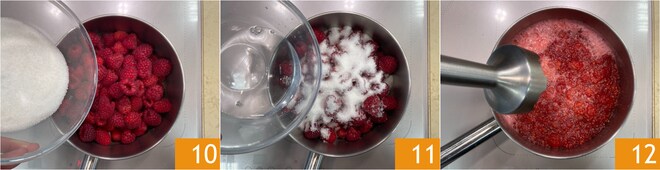 Enquanto isso, prepare a gelatina de framboesas: coloque a gelatina para amolecer em água fria. Em uma panela, coloque as framboesas, depois adicione o açúcar 10 e a água 11. Leve para ferver e cozinhe em fogo médio-alto por cerca de 10 minutos. Quando as framboesas estiverem desfeitas, desligue o fogo e misture com um mixer de imersão 12.