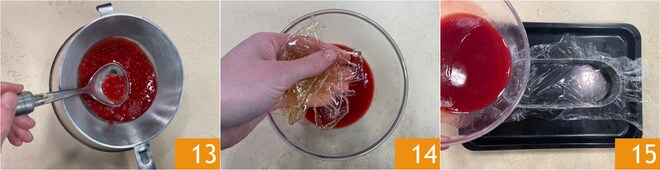 Coe a mistura com um pano fino e recolha o líquido em uma tigela 13. Adicione a gelatina bem espremida 14 e mexa para dissolvê-la completamente. Transfira tudo para uma forma oval de 18 cm forrada com filme plástico 15.