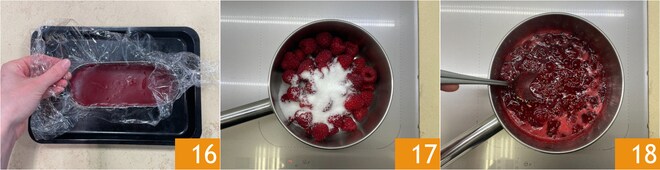Coloque na geladeira e deixe endurecer por uma hora 16. Agora preocupe-se com o molho para decoração: coloque as framboesas e o açúcar em uma panela 17 e deixe reduzir em fogo médio-alto por cerca de 10 minutos até que tenha a consistência de uma compota 18.