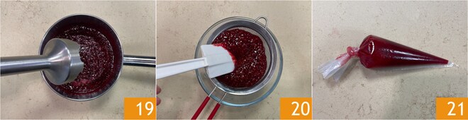 Retire do fogo e misture com um mixer de imersão 19. Coe com uma peneira fina para eliminar as sementes 20, depois transfira para um saco de confeitar 21 e reserve na geladeira.