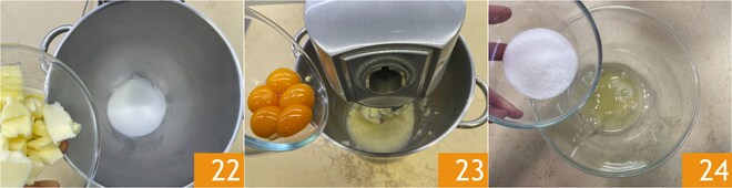 Passe para a preparação do biscoito: despeje na tigela de uma batedeira o açúcar e a manteiga amolecida 22, depois bata até obter uma consistência macia. Adicione as gemas, uma de cada vez 23, até incorporá-las todas. Alternativamente, você pode batê-las rapidamente e adicioná-las em fio à batedeira. Em uma tigela, junte as claras e o açúcar 24.