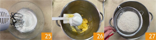 Bata as claras em neve com uma batedeira elétrica 25, depois incorpore-as aos poucos à mistura de manteiga 26, intercalando com a farinha peneirada 27. Misture até obter uma massa homogênea.