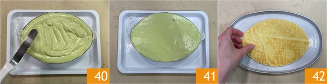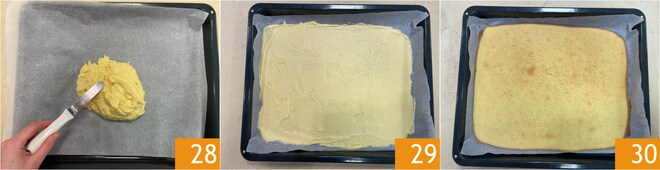 Estenda a massa em uma assadeira forrada com papel manteiga 28 e nivele com uma espátula 29. Asse em forno estático pré-aquecido a 220°C por 8-10 minutos 30.