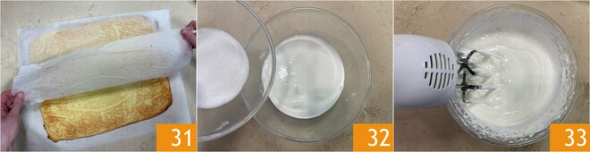 Retire do forno e vire o biscoito em outro pedaço de papel manteiga 31, depois cubra imediatamente com filme plástico; dessa forma, ele permanecerá úmido e elástico. Deixe esfriar, em seguida, corte o biscoito com uma forma oval de 21 cm. Para fazer a bavaroise, em uma tigela, despeje o creme de leite e o açúcar 32, depois bata até obter um ponto de chantilly médio com uma batedeira elétrica 33.