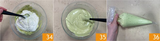 Adicione o creme de leite semi-batido ao creme inglês em 3 etapas 34, misturando para obter uma mistura homogênea 35. Transfira a bavaroise para um saco de confeitar 36.
