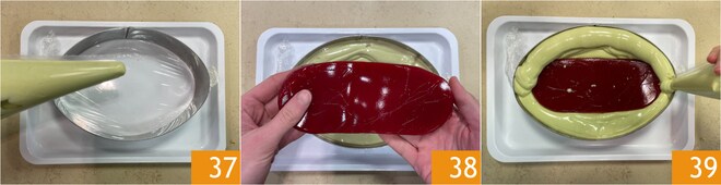 Coloque a mesma forma oval usada para o biscoito em uma bandeja com papel manteiga e forre-a com filme plástico. Preencha a forma com mais da metade da bavaroise 37 deixando um espaço no centro onde você colocará a gelatina de framboesas 38. Cubra com o restante da bavaroise 39.
