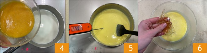 Despeje a mistura de gemas e açúcar na panela com o leite 4 e leve à temperatura de 85°C, mexendo continuamente para evitar que grude no fundo 5. Transfira tudo para uma tigela, adicione a gelatina bem espremida 6 e mexa para dissolvê-la completamente.