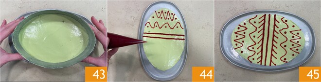 Desenforme delicadamente a bavaroise sobre o biscoito 43; se necessário, você pode aquecer levemente a forma com um maçarico. Finalmente, decore a gosto com o molho de framboesas 44. Deixe descansar na geladeira por uma hora antes de servir a sua linda bavaroise de Páscoa pistache e framboesas 45!