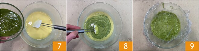 Adicione a pasta de pistache 7 e misture bem 8. Cubra com filme plástico em contato 9 e leve à geladeira para esfriar por uma hora.