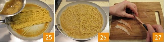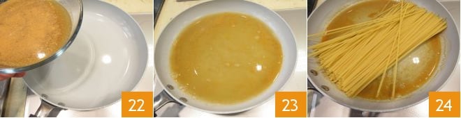 Enquanto isso, aqueça em uma panela grande uma parte do bisque (22-23), adicione as bavette 24 (que devem estar confortavelmente deitadas e você deve conseguir mexê-las facilmente).