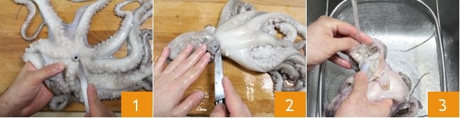 Para preparar as bavette com polvo e camarões, primeiro coloque o polvo para cozinhar. Coloque no fogo uma panela grande cheia de água salgada e deixe ferver. Enquanto isso, limpe o polvo, virando e esvaziando a cabeça, removendo o dente no centro dos tentáculos com uma faca 1 e eliminando os olhos 2; enxágue muito bem sob água corrente fria 3.