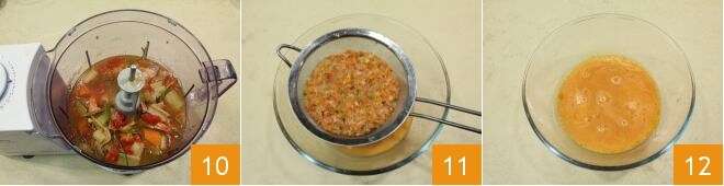 Deixe cozinhar em fogo baixo até reduzir o líquido pela metade, depois bata tudo 10 e coe com uma peneira fina 11. Você obteve seu fumet de crustáceos 12.