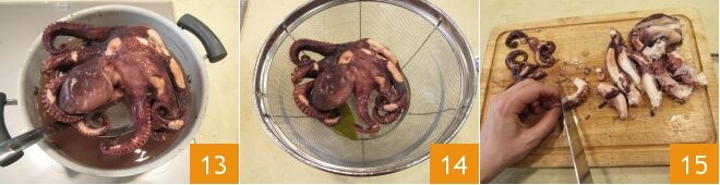 Uma vez cozido, deixe o polvo esfriar levemente dentro de sua água de cozimento, em seguida, escorra-o (13-14) e corte-o em pedaços 15.