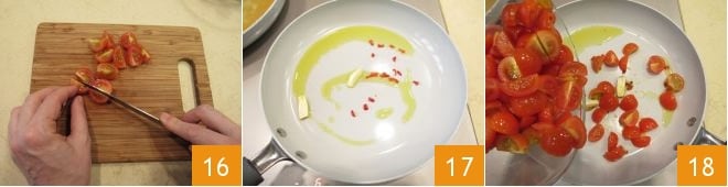 Em seguida, corte os tomatinhos em 4 16. Em uma frigideira, doure o alho e a pimenta sem sementes, cortada em tiras, com o azeite de oliva extra virgem 17, depois adicione os tomatinhos e o sal 18;