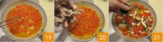 deixe cozinhar por cerca de 10 minutos, então desligue o fogo, remova o alho 19, adicione o polvo 20 e a salsa picadinha 21.