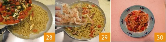 Uma vez que suas bavette estiverem quase cozidas, adicione o molho de tomatinhos e polvo 28, os camarões 29 (se forem menores, você pode deixá-los inteiros), a salsa picada e a pimenta moída. Termine o cozimento e sirva suas bavette com polvo e camarões ainda quentes 30.