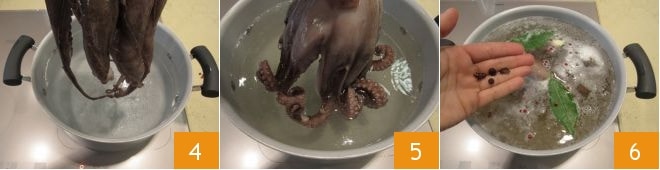 Assim que a água começar a ferver, mergulhe e retire os tentáculos algumas vezes até que se enrolem (4-5) (serão muito mais bonitos de ver quando servidos) e então mergulhe finalmente todo o polvo. Adicione à água também os aromas: o louro, as bagas de zimbro, o dente de alho levemente esmagado e a pimenta rosa em grãos 6. Cubra a panela com a tampa, abaixe o fogo ao mínimo (a água deve apenas ferver lentamente) e deixe cozinhar assim por 40 minutos.