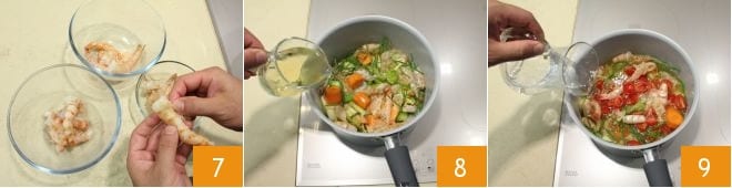 Cubra com o fumet fervente 25. Mexa continuamente para não grudar, adicione aos poucos o fumet quente até chegar a 3 minutos do ponto de cozimento 26 (se acabar o fumet antes do final do cozimento da massa, você pode usar água quente ou um caldo de legumes leve). Enquanto isso, corte os camarões ao meio no sentido do comprimento 27 (se forem menores, você pode deixá-los inteiros).