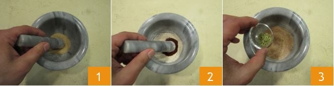 Para preparar o beer can chicken no forno, comece pela preparação do Caldo de carne, em seguida, faça o rub. Coloque no pilão o açúcar mascavo 1 e comece a moer com o pilão. Quando você obtiver um pó fino, adicione a páprica 2 e moa novamente. Adicione também o orégano e moa 3.