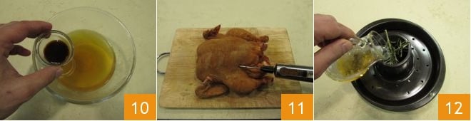 Para as injeções: pegue o caldo de carne preparado anteriormente e resfriado e adicione o molho Worcestershire. Retire o líquido com uma seringa de carne e injete-o na musculatura do frango 11, retirando a seringa enquanto insere o líquido. Este movimento permite uma melhor difusão dos líquidos internamente. Durante a injeção, você verá os tecidos incharem, indicando uma correta infiltração dos líquidos. Uma grande parte será perdida, mas o resultado será uma carne muito úmida e suculenta. Despeje a cerveja na parte central da assadeira adequada para a cocção do frango com a lata e adicione um ramo de alecrim 12.