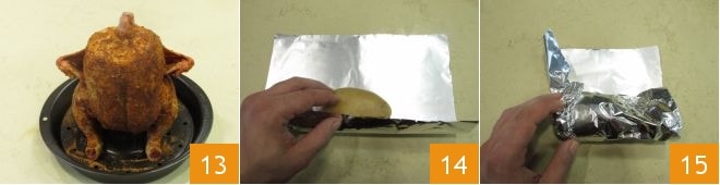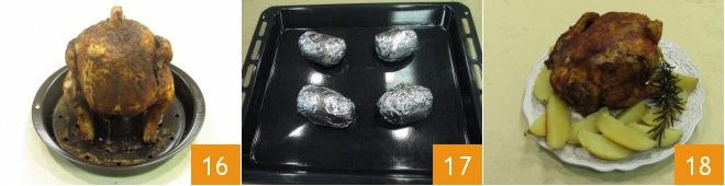 Coloque o frango no suporte 13 e asse em forno estático pré-aquecido a 195°C por cerca de 45/50 minutos. Um acompanhamento rápido pode ser feito com batatas assadas no papel alumínio. Lave bem as batatas e, sem tirar a casca, envolva-as no alumínio (14-15), depois coloque-as em uma segunda assadeira para inserir na prateleira mais baixa do forno. Cozinhe junto com o frango pelo mesmo tempo e na mesma temperatura.