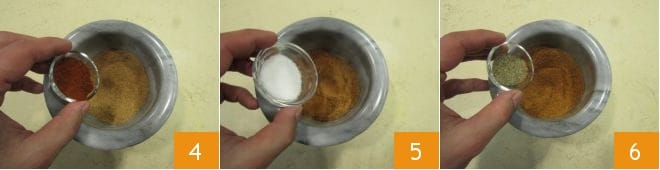 Junte a pimenta vermelha 4, o sal 5 e a pimenta-do-reino 6, continuando a moer. Tudo deve ficar bem fino.