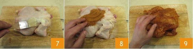 Molhe um pincel na manteiga derretida e regue levemente o frango em todas as partes 7. Comece então a espalhar o rub em toda a superfície 8, tanto externa quanto interna do frango, e massageie bem com as mãos para que os aromas penetrem nas fibras, saborizando a carne 9. Envolva o frango em filme plástico e deixe descansar na geladeira por pelo menos algumas horas.