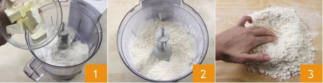 Para preparar os befanini, comece colocando a farinha e a manteiga bem fria no processador de alimentos 1. Ligue o aparelho e triture tudo até obter uma mistura arenosa 2, que depois você transferirá para uma bancada, na clássica forma de fonte com um buraco no centro 3.