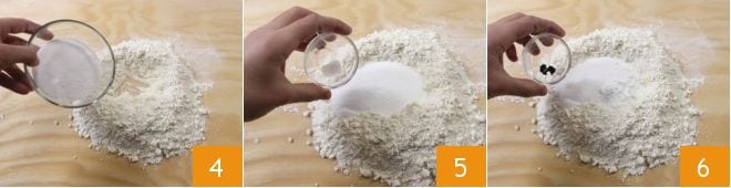 Adicione agora o açúcar 4, o fermento 5, as sementes da fava de baunilha 6,