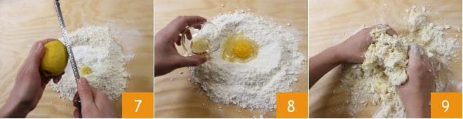 as raspas de limão raladas 7, o ovo e, por fim, o rum 8. Misture tudo com as mãos 9 até obter uma massa lisa e compacta,