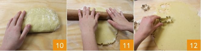à qual você dará a forma de um bloco, depois achate um pouco com as mãos para achatá-lo, cubra com filme plástico 10 e coloque na geladeira para descansar por pelo menos uma hora. Após esse tempo, abra a massa com a ajuda de um rolo 11 até obter uma folha fina (cerca de 3 mm), depois corte os biscoitos com cortadores de formas natalinas 12.
