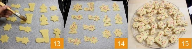 Transfira os biscoitos obtidos para uma assadeira coberta com papel manteiga, pincele-os com a clara de ovo 13 e polvilhe com confeitos coloridos para doces 14. Asse os befanini em forno estático, pré-aquecido, a 180°C por 7-8 minutos (mantenha o controle da cozedura para que os biscoitos não escureçam muito). Uma vez prontos, retire do forno e deixe esfriar em uma grade 15. Os befanini estão prontos: Feliz Dia de Reis!