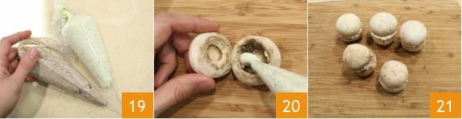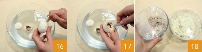 Enquanto isso, você pode cuidar da limpeza dos cogumelos, retire o caule girando-o delicadamente, limpe-os rapidamente com água fria e seque-os com um pano e descasque os chapéus dos champignons com a ajuda de uma faquinha 16: com a ajuda de uma faquinha, retire também a borda 17 e parte do interior dos cogumelos, à medida que os limpa, coloque-os em uma tábua. Retire os cremes da geladeira 18 e trabalhe-os rapidamente com um batedor para misturá-los novamente;