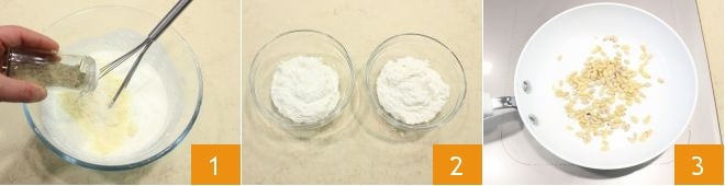 Para preparar os beijos de champignon comece pelo creme de recheio: coloque a ricota em uma tigela e misture tudo com um batedor até obter um creme liso sem grumos. Tempere com Parmesão ralado, sal e pimenta 1, misture para combinar os ingredientes. Divida o creme em duas tigelas diferentes 2. Torre os pinhões por alguns segundos em uma frigideira 3 para dourá-los e torná-los mais crocantes,