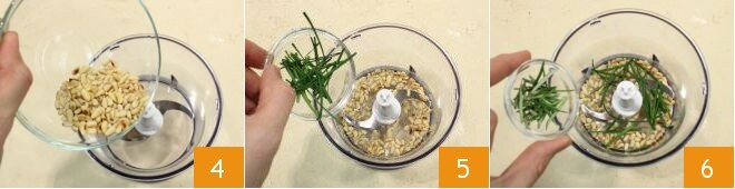 transfira-os para o processador de alimentos com lâminas 4, adicione também as ervas frescas lavadas e secas: alguns talos de cebolinha 5, as agulhas de alecrim 6,