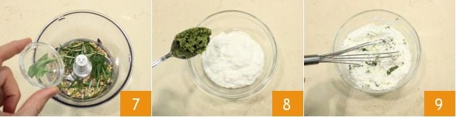 as folhas de sálvia 7, sal e pimenta com a pimenta branca. Bata tudo para obter uma mistura cremosa que você adicionará a um dos dois cremes de ricota 8, misture com um batedor para combinar os ingredientes 9