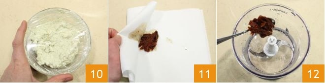 depois cubra o creme com filme plástico 10 e coloque na geladeira por cerca de 30 minutos. Cuide do segundo creme: pegue os tomates secos em conserva, escorra-os, seque o excesso de óleo com um pano de cozinha 11 e coloque-os no processador 12,
