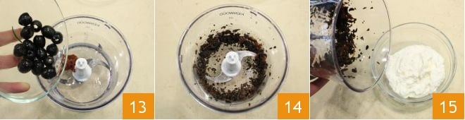 adicione também as azeitonas pretas sem caroço 13 e bata tudo por alguns instantes 14, incorpore a mistura ao restante do creme de ricota 15, tempere com uma pitada de pimenta branca e sal, misture com uma colher para combinar os ingredientes, cubra com filme plástico e deixe endurecer na geladeira por 30 minutos.