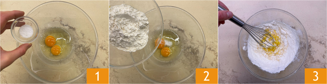 Para preparar os benderniki, comece pela massa das panquecas: quebre os ovos em uma tigela, depois adicione o sal 1, a farinha 2 e misture com o batedor 3.