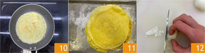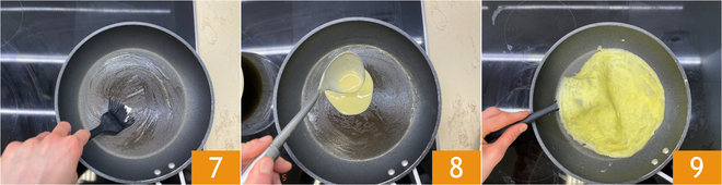 Unte com manteiga uma frigideira antiaderente de 20-22 cm 7 e, uma vez quente, despeje no centro uma concha de massa 8. Cozinhe em fogo médio por 1-2 minutos; quando as bordas começarem a se soltar, vire delicadamente a panqueca com uma espátula 9.