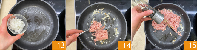 Derreta a manteiga em uma frigideira, adicione a cebola e refogue por alguns minutos 13. Adicione a carne moída 14, sal e pimenta a gosto 15.
