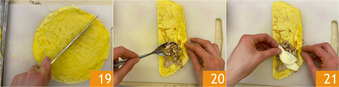 Você está pronto para montar os benderniki: divida ao meio as panquecas 19, depois coloque uma colher de recheio na extremidade de meia panqueca 20 e disponha o queijo por cima 21.