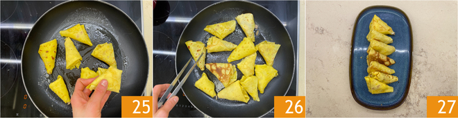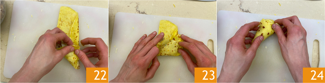 Dobre a extremidade da panqueca sobre o recheio para formar um triângulo 22 e continue dobrando tudo desta forma até chegar à outra extremidade 23. Finalmente, insira as abas para dentro para selar o pacotinho 24. Repita o procedimento para formar 12 benderniki no total.
